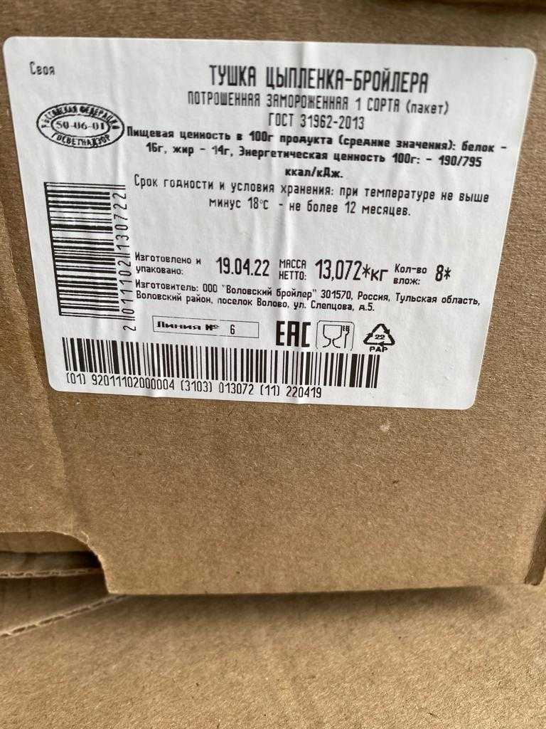 Пищевая и энергетическая ценность на 100г. продукта (среднее значение): Белки-16г. Жиры-14г. Энергетическая ценность 100г. продукта: 190ккал/795кДж. Cрок годности и условия хранения: 12 месяцев при температуре не выше минус 18°C.