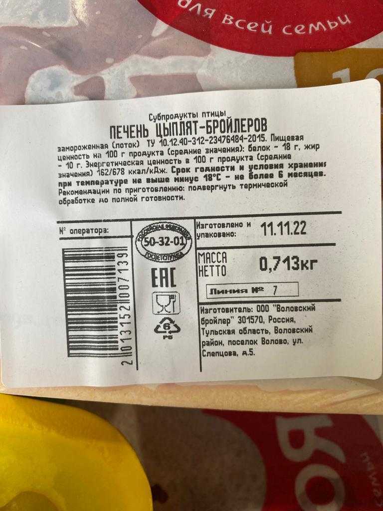 Пищевая ценность на 100г. продукта (средние значения): белок-18г, жир-10г. Энергетическая ценность в 100г. продукта (средние значения) 162/678 ккал/кДж. Срок годности и условия хранения при температуре не выше минус 18С- не более 6 месяцов
