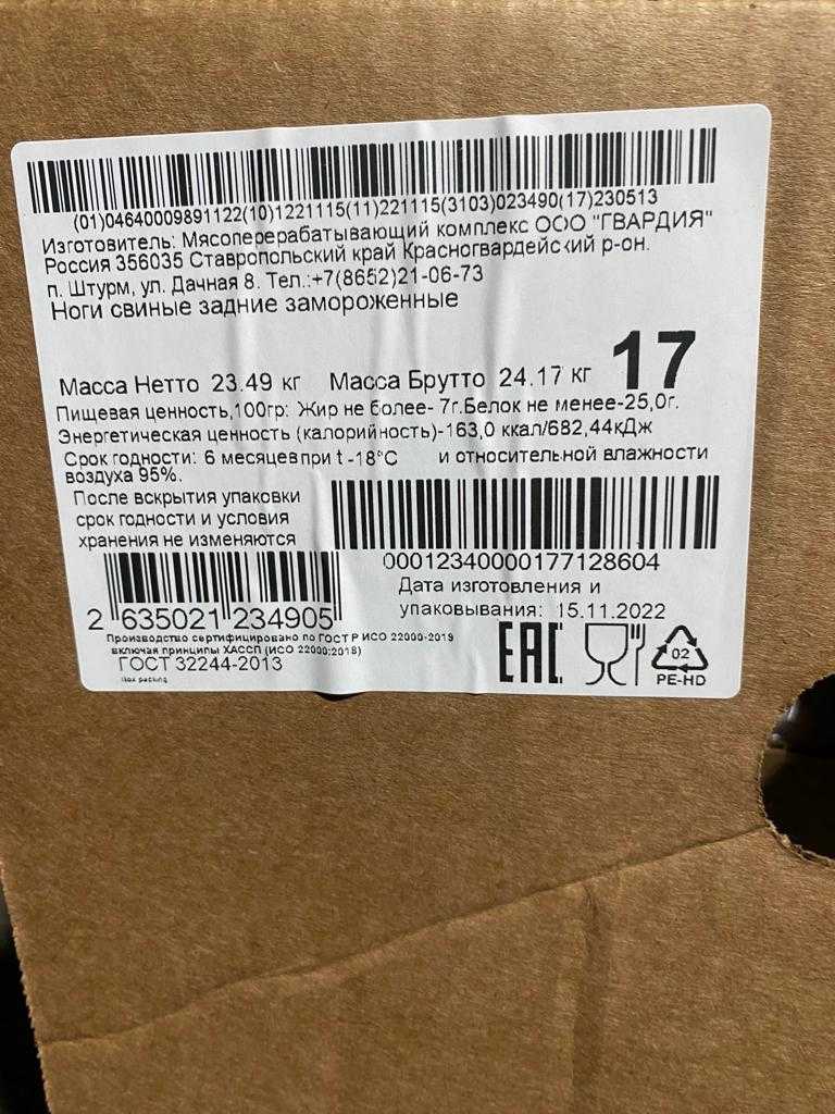 Энергетическая ценность (калорийность) 163,0 ккал/682,44 кДж: Срок годности: 6 месяцев при t-18°С